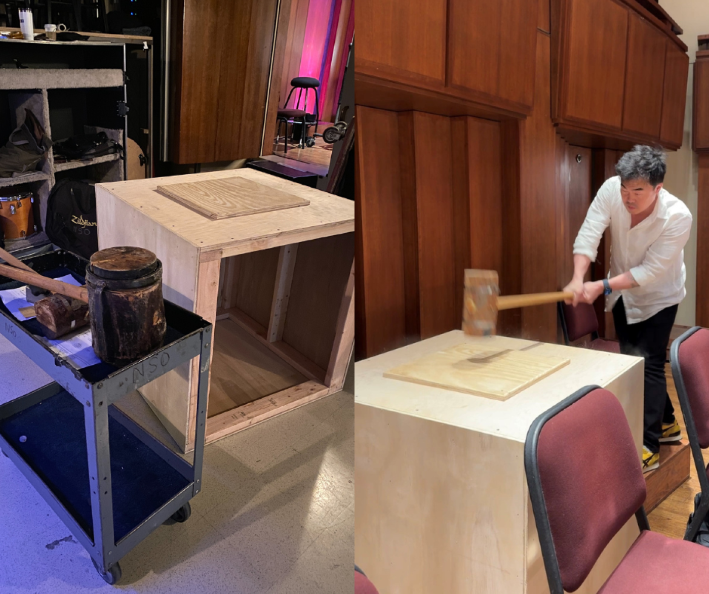 Over at the Concert Hall, the National Symphony Orchestra is in full gear. May 8-10, Maestro Gianandrea Noseda conducts Gustav Mahler’s 6th Symphony, complete with a specially constructed percussion “instrument” for the third movement hammer blows of fate. According to the composer’s wife, Alma Mahler, these hammer blows represented three traumatic events in his life: the death of his eldest daughter, the diagnosis of heart disease and his resignation from the Vienna Opera. Mahler later took out one of the blows for musical reasons, but some conductors, including Maestro Noseda, insist on all three. NSO principal percussionist Eric Shin, aka “Thor” strikes the specially built box (see photo) with the hammer of fate.