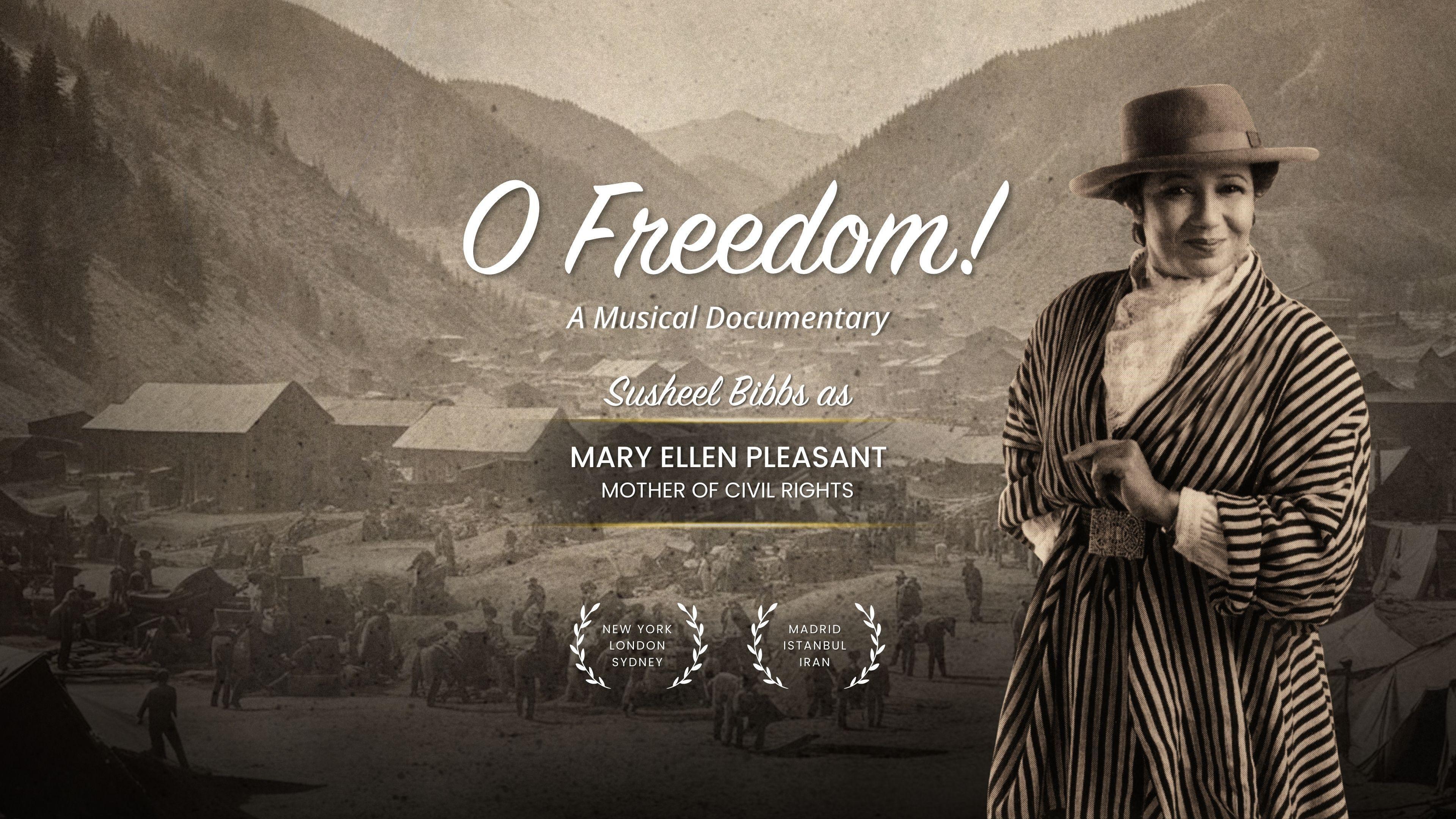 O FREEDOM! a rousing documentary musical unfolds the life of civil-rights icon Mary Ellen Pleasant. Susheel Bibbs' live, one-woman performance in word & song, uses Pleasant's own words, landmark research, music of the times, an intermission interview, & archival visuals to reveal a woman of mystery & power. Jacqueline Hairston (piano),Pope Flyne (drums), MET opera star Raehann Bryce-Davis hosts.